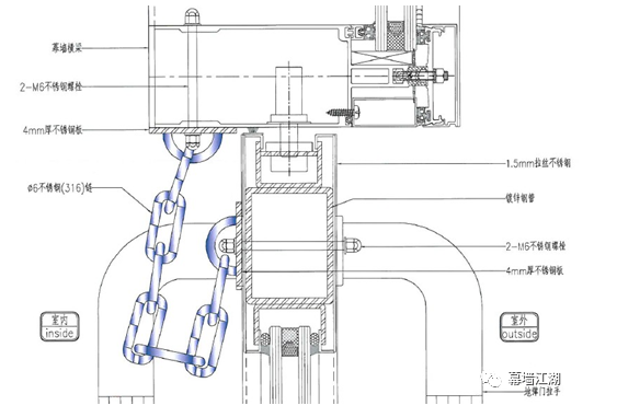 在門扇與門框之間增加一根不銹鋼防墜鏈(存在雙向開啟門與單向門鏈碰撞風險)